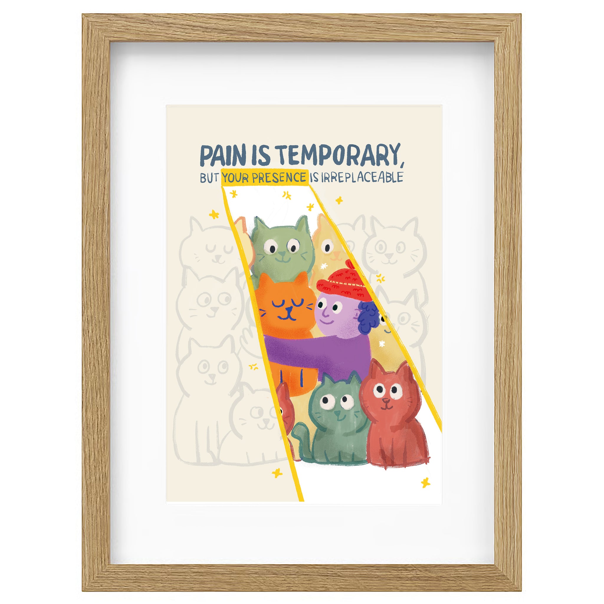 Los gatitos te abrazan, los colores te envuelven y el mensaje te susurra: tu presencia hace la diferencia.